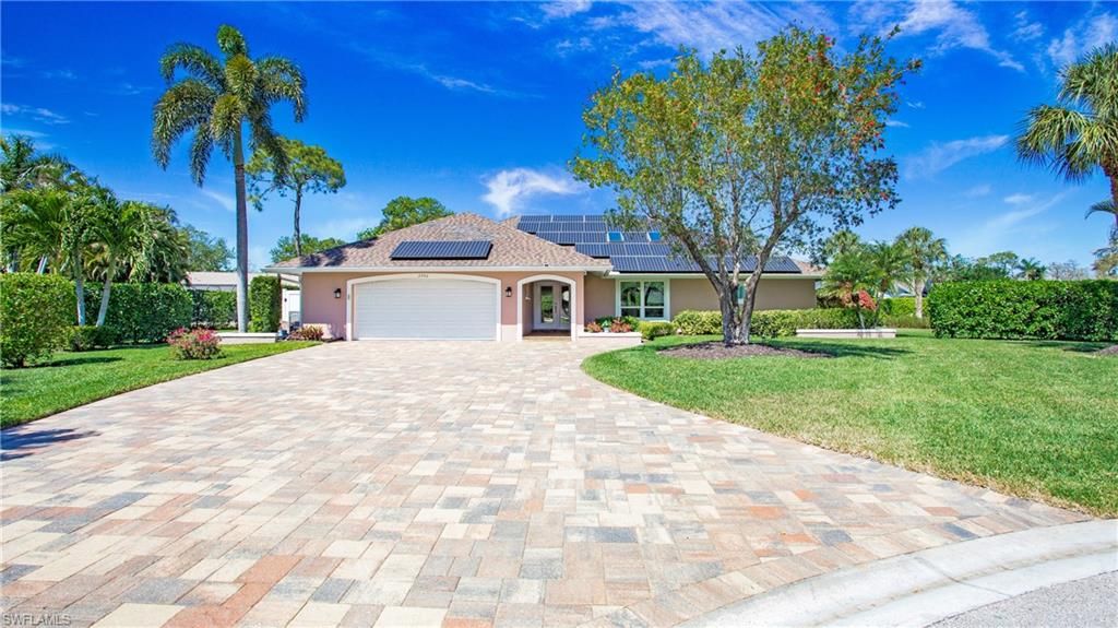 Embrace the good life in this METICULOUSLY UPDATED single family pool home located in desirable North Naples! The 1,920 sq ft residence with 3 bedrooms, 2 baths, oversized 2-car garage, and the potential to create a den or office, boasts NUMEROUS UPGRADES. These include hardwood floors, crown molding, phantom screen on front door, ceiling fans throughout, newer roof (2019), and HURRICANE IMPACT WINDOWS, DOORS AND SKYLIGHTS. The open concept kitchen features stainless steel appliances, granite countertops, and an extended island/breakfast bar that seats up to five - perfect for both family living and entertaining. Both baths have been beautifully upgraded with frameless showers and granite and quartz countertops. Designed for comfort and efficiency, the home is equipped with a WHOLE-HOUSE PHOTOVOLTAIC SOLAR SYSTEM featuring two TESLA POWERWALLS for backup power, a 500-GALLON PROPANE TANK that fuels both the indoor and outdoor kitchen, a connection setup for a future fireplace and a 220 electrical outlet for charging your EV. You and your guests can enjoy the ULTIMATE IN OUTDOOR LIVING, whether dining on the spacious covered lanai or relaxing on the expanded pool deck or stand-alone spa. Nestled on a quiet .38-acre CUL-DE-SAC LOT, this fabulous home offers total privacy with a lush Clusia hedge surrounding the property and an extended paver driveway which can park 6+ cars. Imperial Golf Estates is close to local shopping and dining, Mercato, Waterside Shops, Artis-Naples, and just a short drive to Downtown Naples and miles of sandy white beaches! Call or Text Steven Chase at 239-287-0539 for more information.